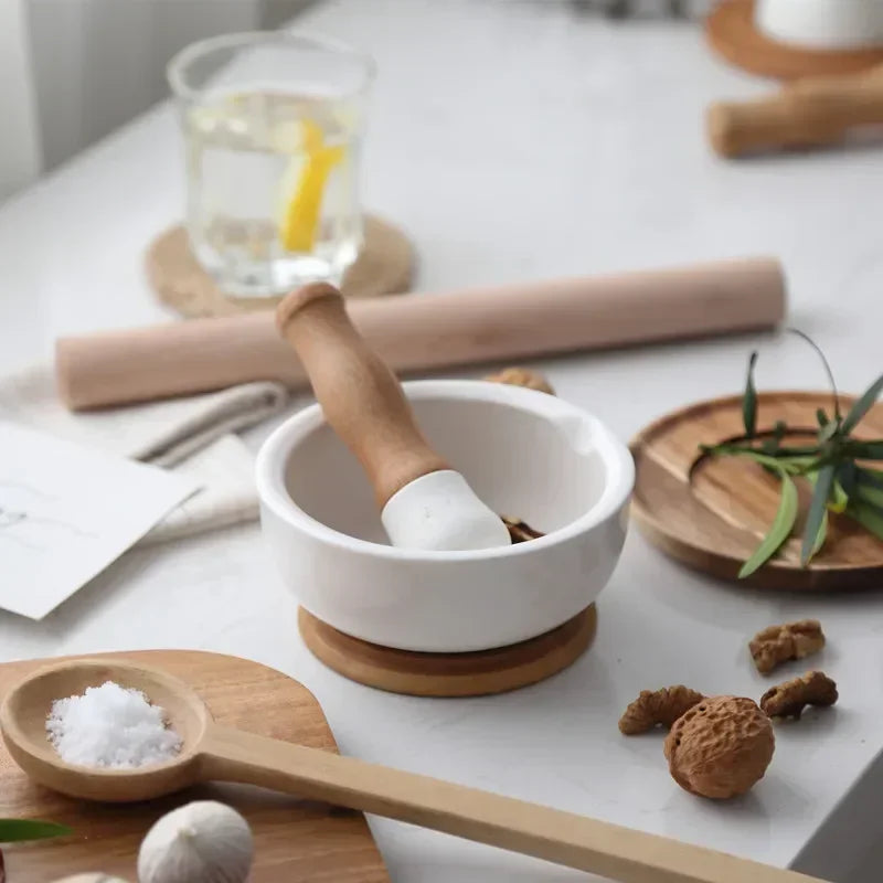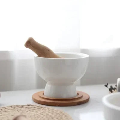 Елегантна керамічна ступка з натуральним дерев'яним товкачиком — незамінний помічник для тих, хто цінує свіжість спецій, натуральні інгредієнти та здорове харчування. Поєднання білої кераміки та теплого дерева створює гармонійний вигляд, який ідеально впишеться в будь-який кухонний інтер'єр.
